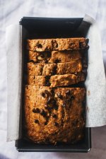 Grease and line a 9×5 inch loaf pan. Preheat your oven to 175 C