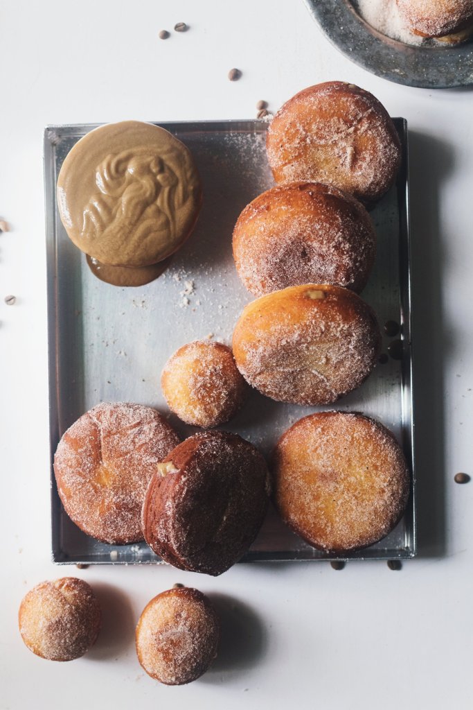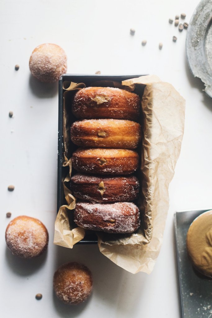 Fill a piping bag with the coffee pastry cream, poke into the donuts (gently) and squeeze in the filling. Repeat for all the doughnuts. Enjoy.
