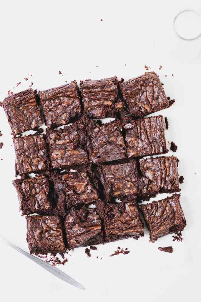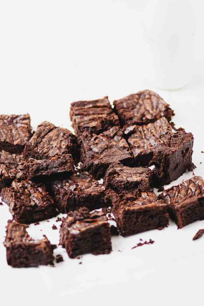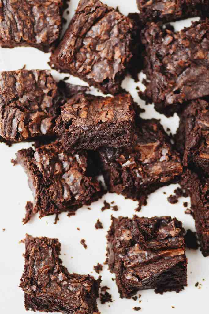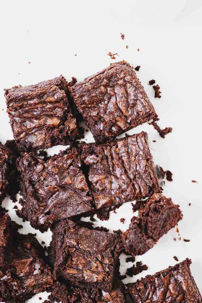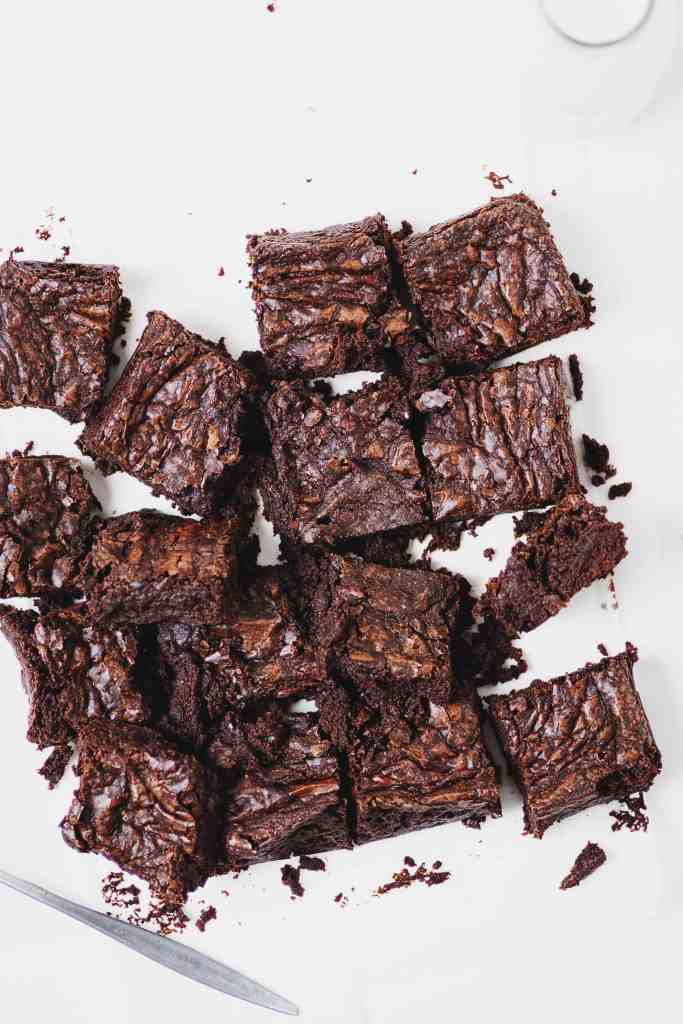 The easiest, most delicious, fudgy chocolate brownies you will make, I promise. They are intensely chocolatey and eggless with a crackled crust.