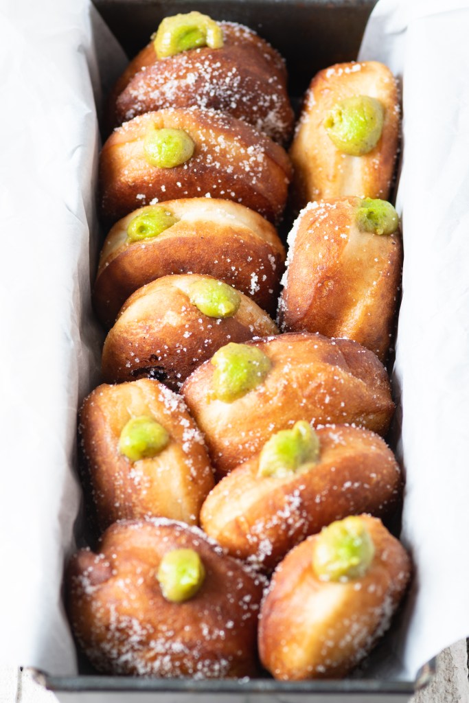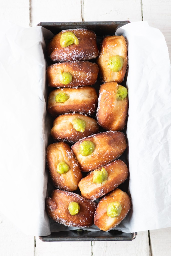 Fill the Pistachio Rose cream into a piping bag fitted with a narrow piping tip. Squeeze the filling into the warm doughnut till it is full.