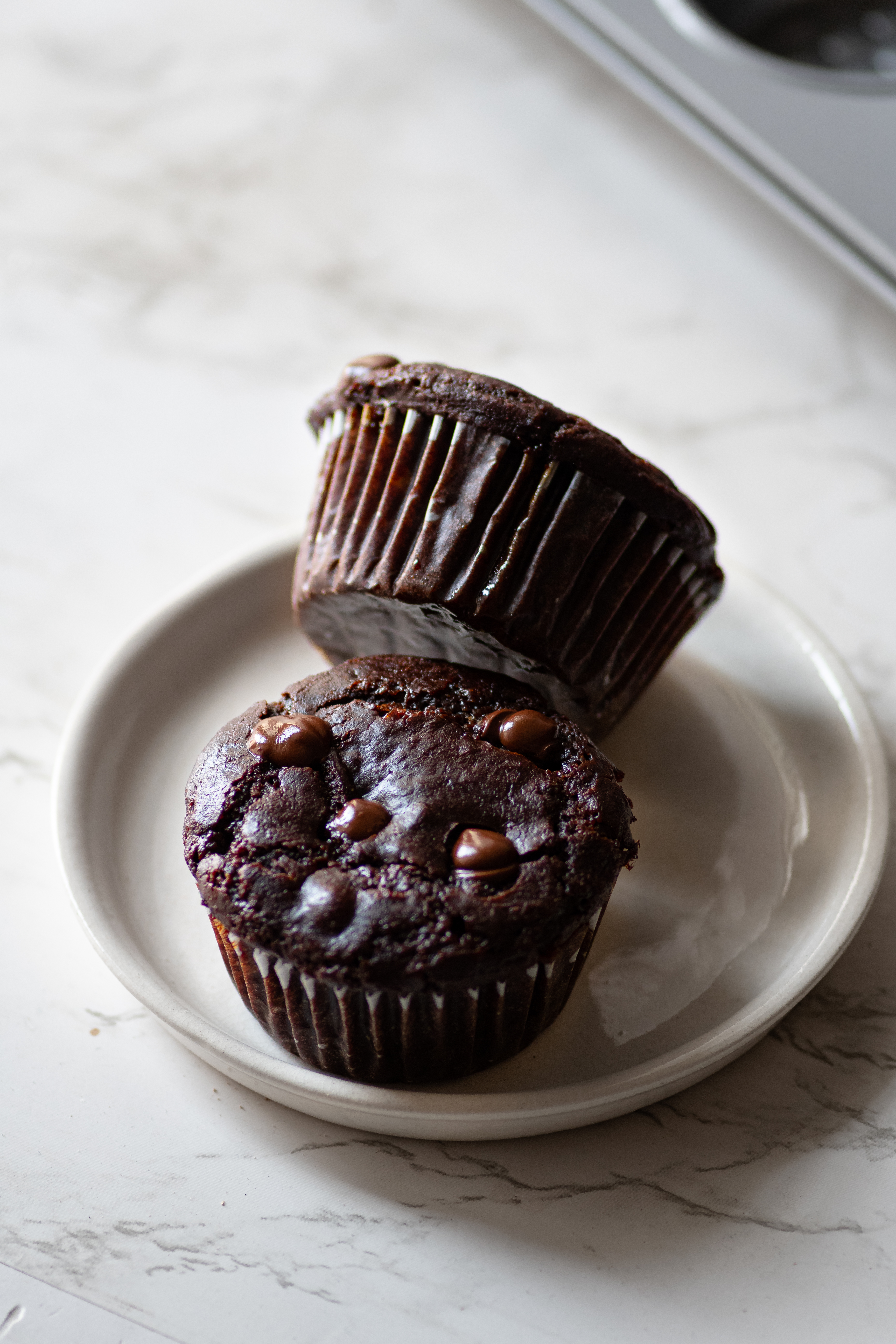 Using an icecream scoop pour the batter into the prepared muffin pan, fill it up almost to the top but not completely. Add a few more chocolate chips on top of the muffins if you like.